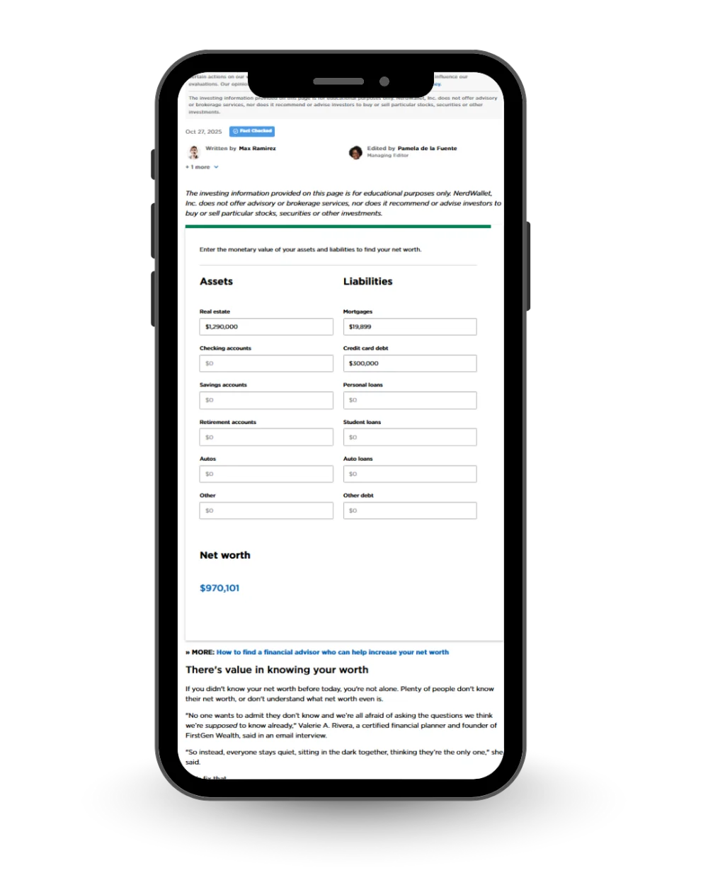 Get clear on your financial picture with this easy to use online Net Worth Calculator powered by NerdWallet. Understanding your net worth is a powerful step toward building lasting wealth and making smarter money decisions. Simply enter your info to access the calculator and start seeing where you stand, no guesswork, just clarity.